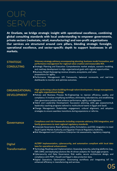 At One Gate, we go beyond consulting — we provide integrated business and investment solutions designed to empower organizations, unlock opportunities, and deliver sustainable success.